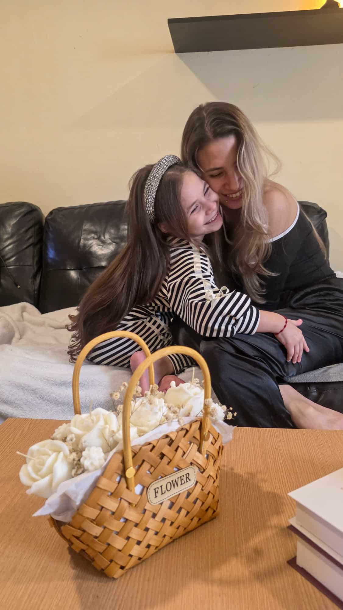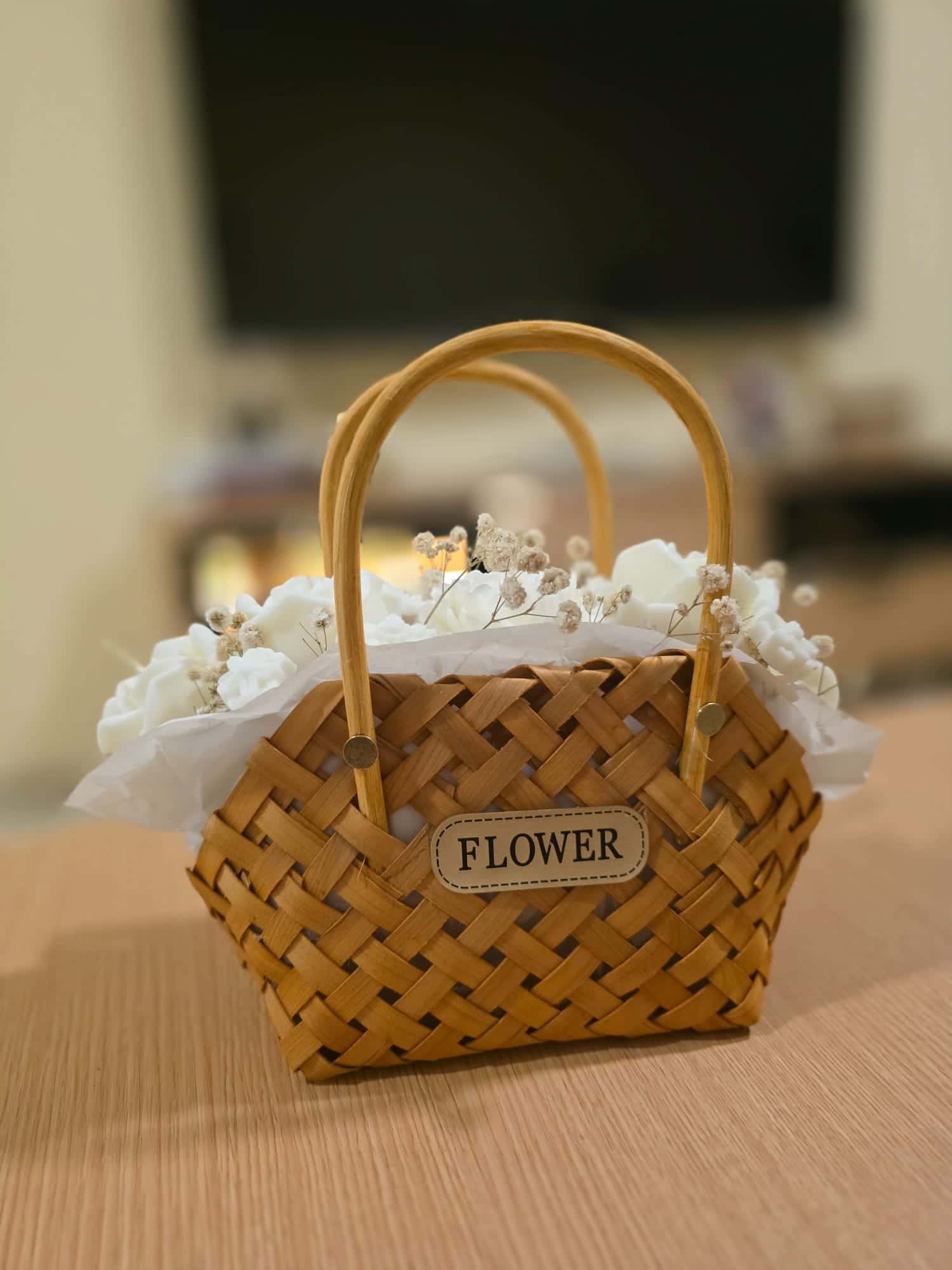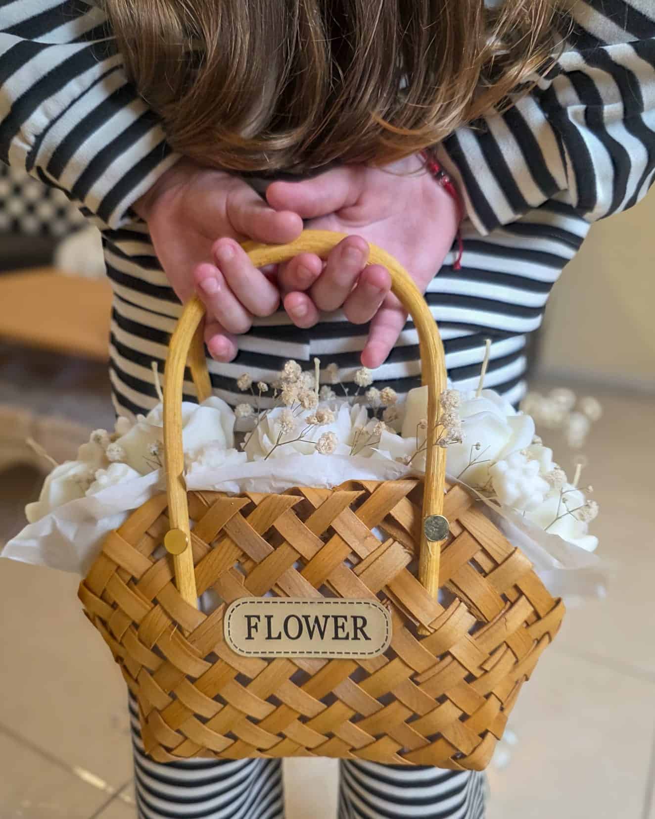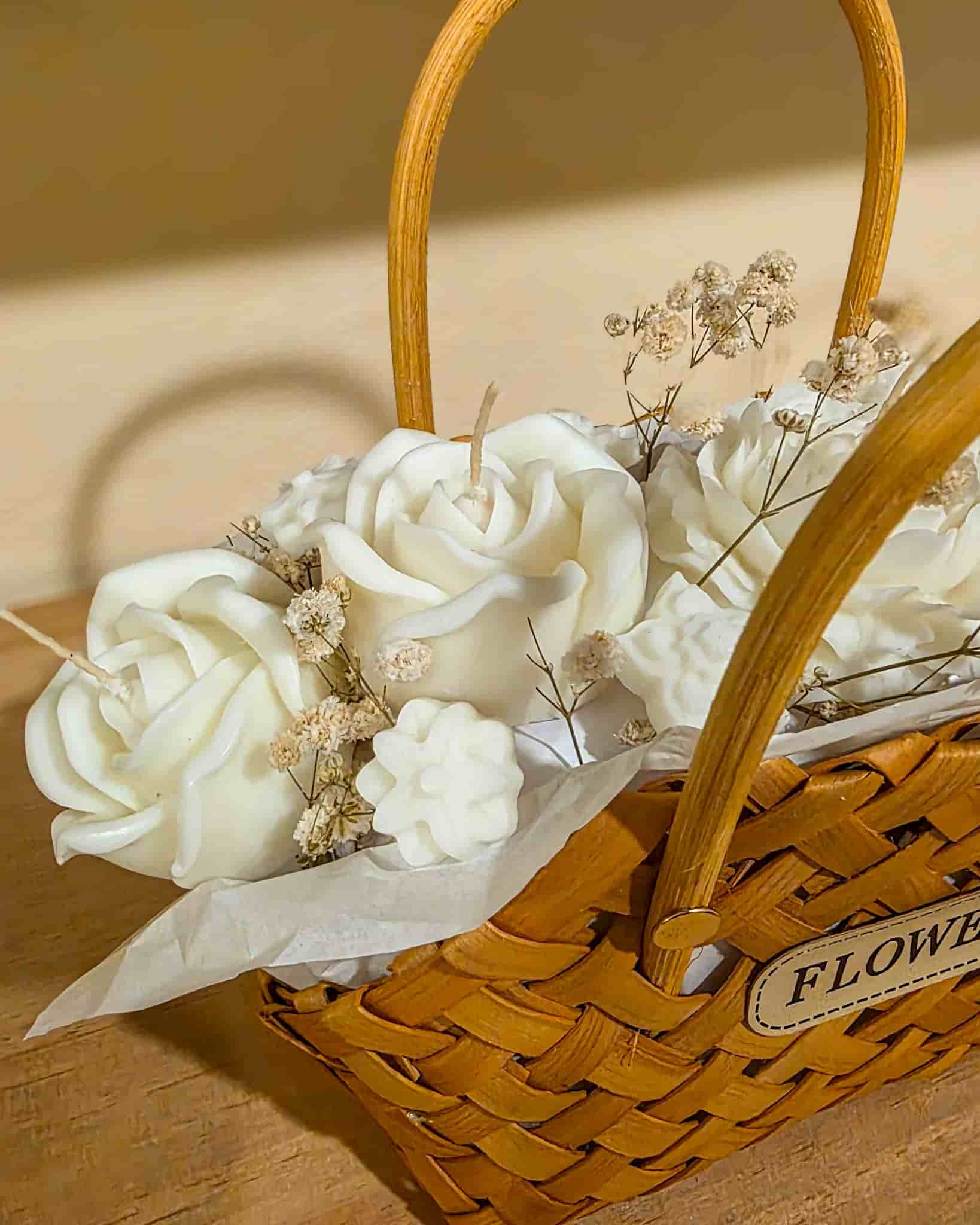 Un regalo que emociona antes de abrirlo. Esta exclusiva cesta de mimbre trenzada no contiene flores perecederas, sino delicadas velas artesanales aromáticas esculpidas como rosas blancas. Perfecta para crear ambientes boho-chic o como ese regalo inolvidable (como se ve en nuestras fotos de familia). Artesanía pura, cero mantenimiento.